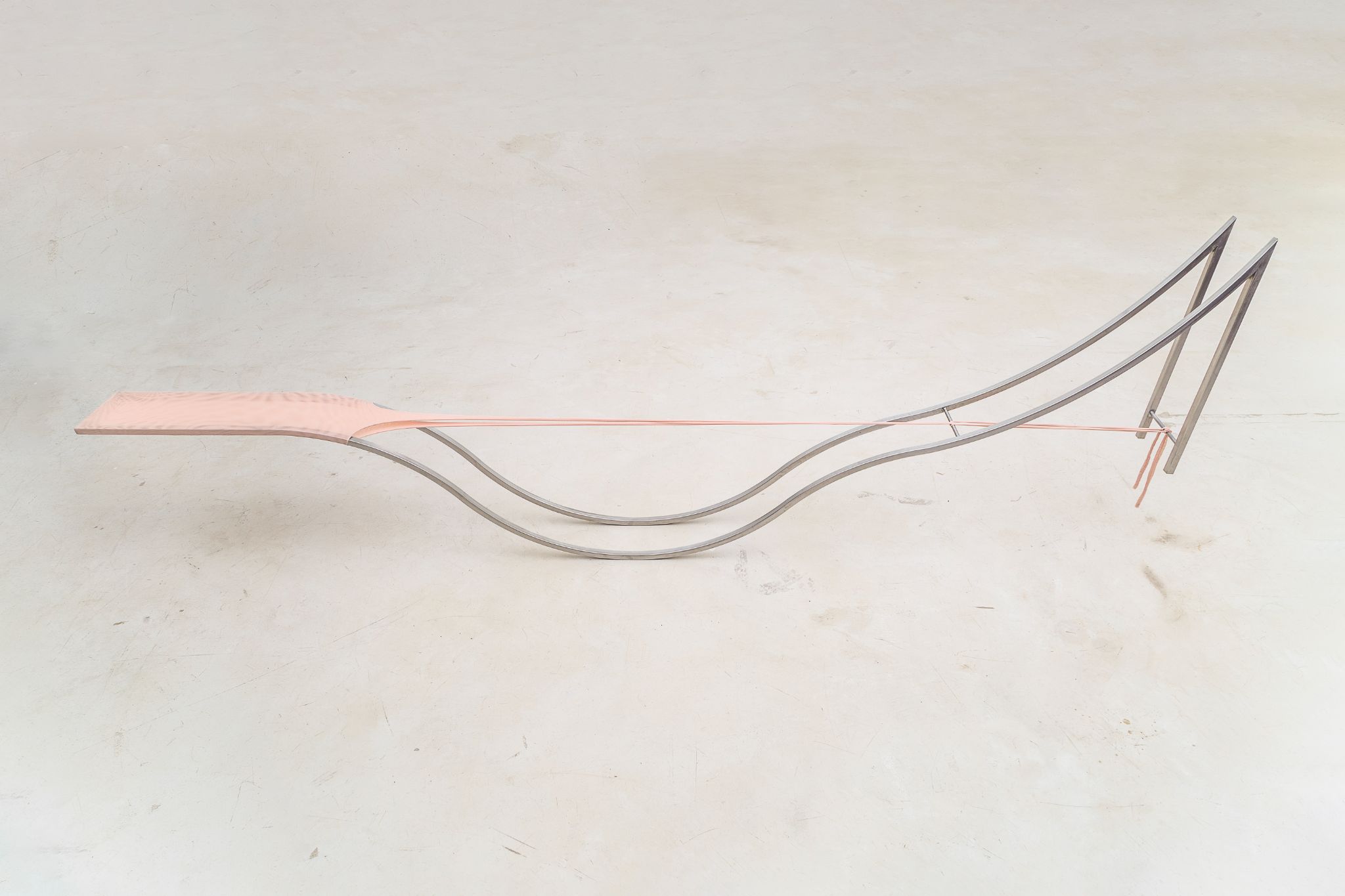 To dedicate a life to making sculptures resembles Delavenay’s endeavor, because it implies advocating for a project willing to engage with elusive, shifting, and fluid phenomena. In VERBO, Marcolina Dipierro executes, following personal scores, pieces that in their structure describe the behavior of intangible forces. The sculptures in this exhibition operate through precise actions and gestures, functioning like verbs without conjugations or markers: where the potency of the infinitive still lies latent. Certain forms and modes recur through a cyclical gaze that relies on the infinite possibilities of combining elements. Guided by impulses that are untransferable yet direct, the artist sharpens edges, softens curves, and composes situations of balance. She unfolds textures that reveal themselves as ambitious and thirsty, sensual and precise: brief textile moments elongate, seem to hold, nearly to tear apart. In Marcolina’s work, a formal polysemy is fully verifiable.
