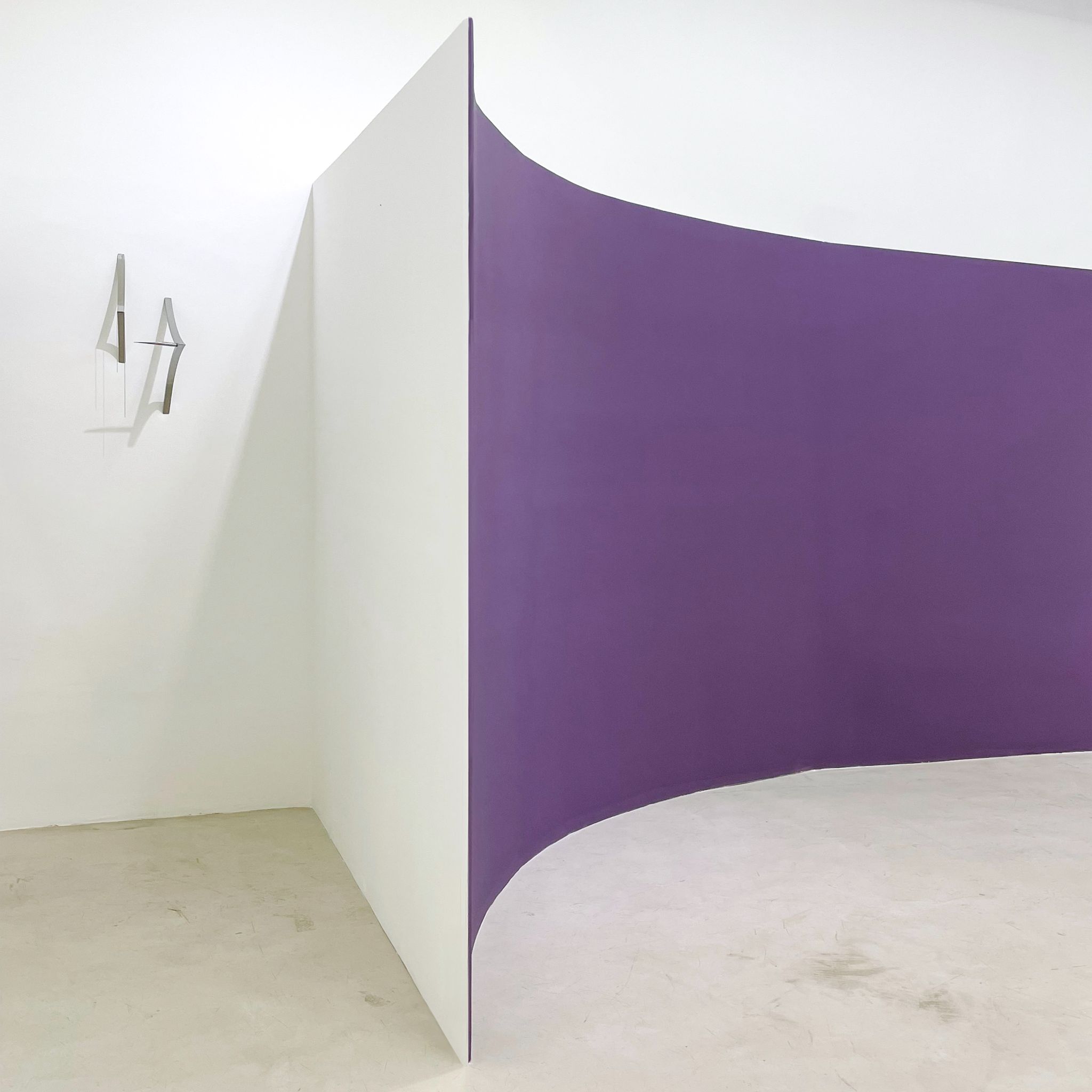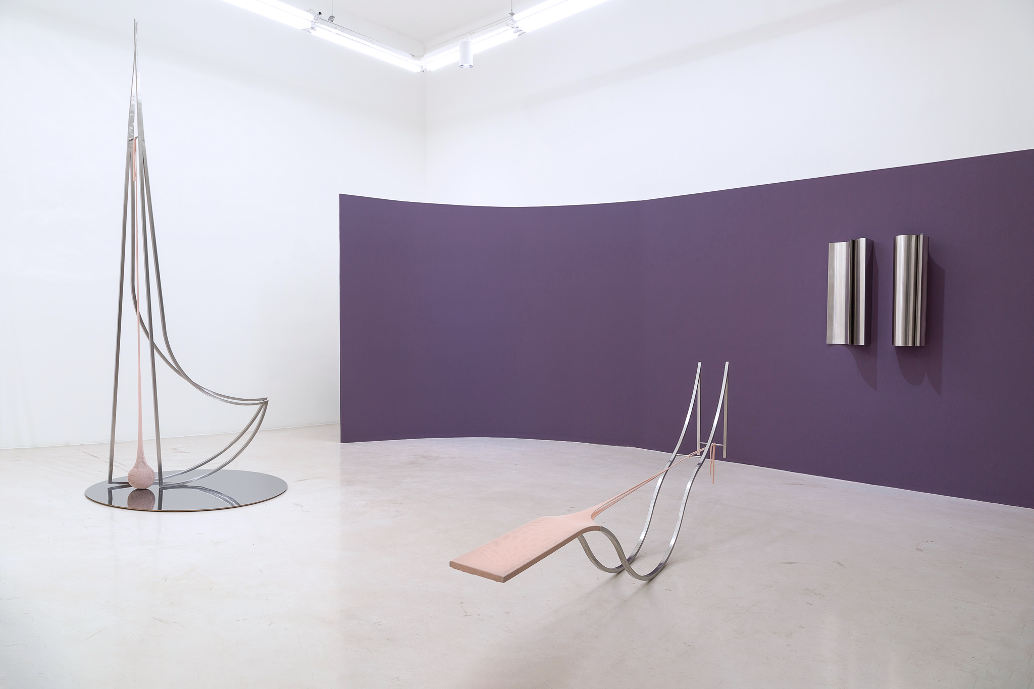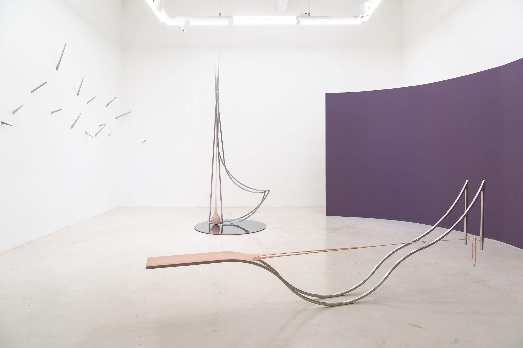 To dedicate a life to making sculptures resembles Delavenay’s endeavor, because it implies advocating for a project willing to engage with elusive, shifting, and fluid phenomena. In VERBO, Marcolina Dipierro executes, following personal scores, pieces that in their structure describe the behavior of intangible forces. The sculptures in this exhibition operate through precise actions and gestures, functioning like verbs without conjugations or markers: where the potency of the infinitive still lies latent. Certain forms and modes recur through a cyclical gaze that relies on the infinite possibilities of combining elements. Guided by impulses that are untransferable yet direct, the artist sharpens edges, softens curves, and composes situations of balance. She unfolds textures that reveal themselves as ambitious and thirsty, sensual and precise: brief textile moments elongate, seem to hold, nearly to tear apart. In Marcolina’s work, a formal polysemy is fully verifiable.